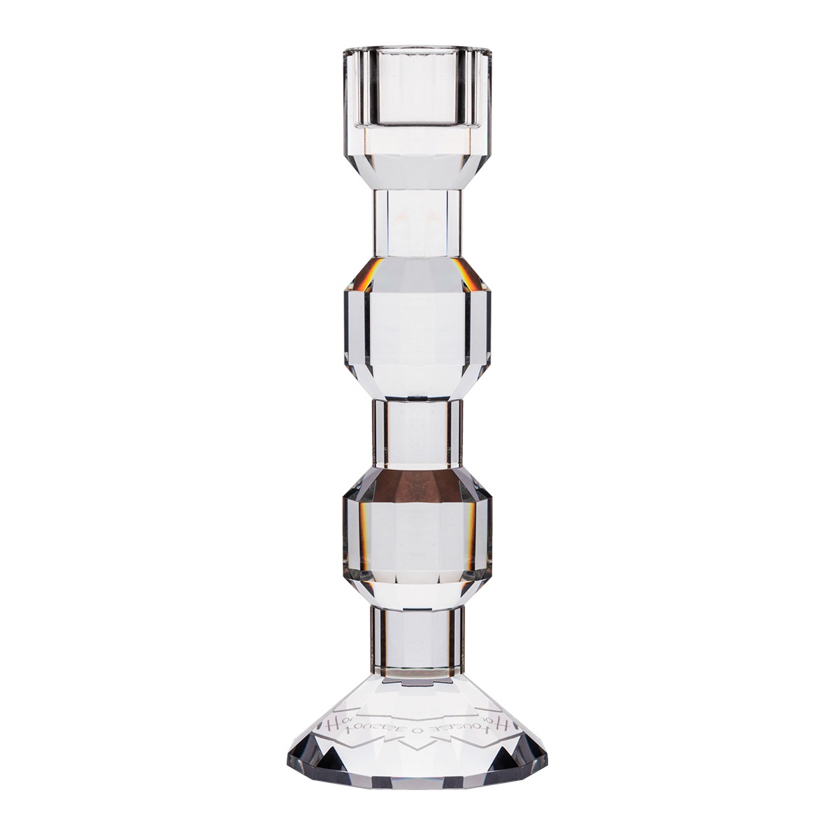 The Iris candle holder is meticulously handmade from solid glass with a magical glow and crystal effect. This lovely clear glass candle holder measures 18 cm in height and is designed for taper candles.