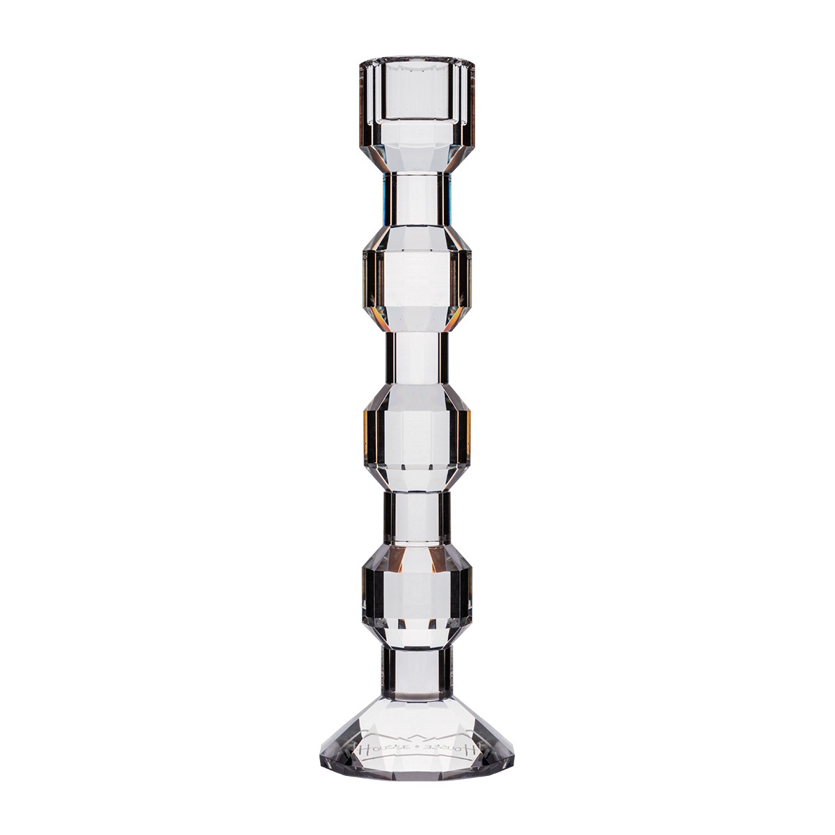 The Iris candle holder is meticulously handmade from solid clear glass. When the sun's rays meet the glass, Iris candle holder produces a magical crystal effect that illuminates the room. This popular candle holder measures 25 cm in height and is designed for taper candles.
